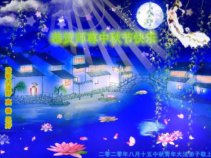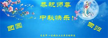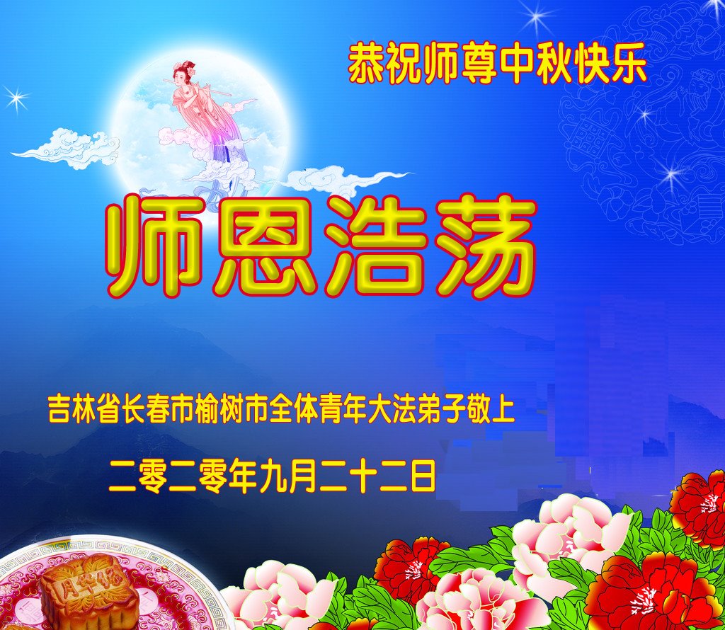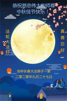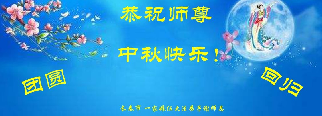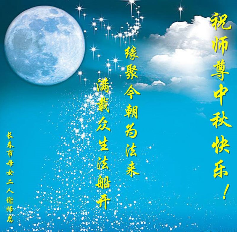 师尊您好!中秋佳节倍思亲,大陆大法弟子日日夜夜都在盼望师尊早日回来。我是吉林省长春市德惠市大法弟子,代表两个姐姐和几个学法小组的弟子向师尊问中秋好!师尊您好!弟子决不辜负您的重望,在最后有限的时间里,勇猛精進,做好三件事,向师尊捧上一颗诚挚向善的心。谢谢师尊! 吉林省长春地区一大法弟子恭祝师尊中秋快乐!