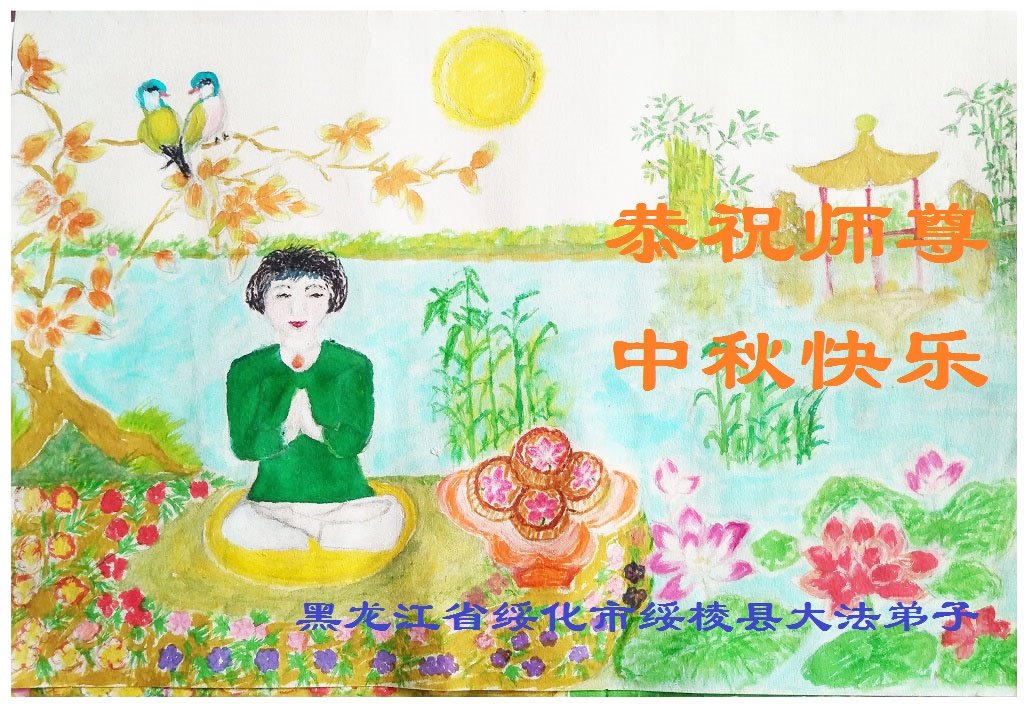 我是一名老年大法弟子,虽然对美术一窍不通,但是为了表达对师尊慈悲苦度的感恩与思念,在传统中秋佳节来临之际,参考明慧网的有关作品和自己的感悟。用笨拙的画笔用心的描绘出一幅,奉献师尊。感恩师尊的保护和给予--让弟子稳健的走过了二十多年的修炼路。作为正法弟子,在师尊延续来的宝贵时间里,要更加坚定的信师信法,不迷不惑;在尽力修好自己的同时,不忘使命抓紧救度众生,走好最后的正法路,圆满随师还。弟子中秋跪拜师尊,祝师尊中秋快乐! 黑龙江省七台河市桃山区大法弟子恭祝师尊中秋节快乐!