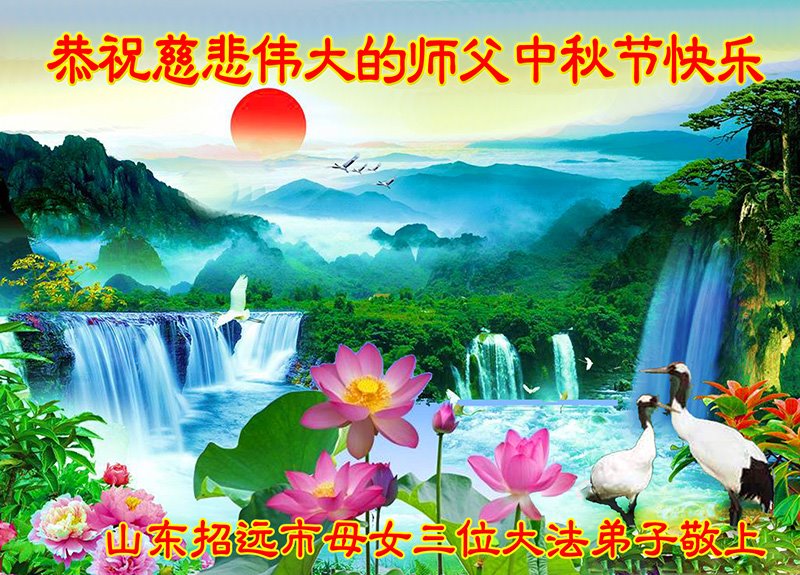 尊敬的师尊您好!中秋节即将来临,我们学法小组的全体大法弟子恭祝师尊中秋节快乐!师父您辛苦了!谢谢师尊的慈悲救度!在这不平凡的一年里,我们一定珍惜宝贵的时间,多学法,多去执着,做好三件事,跟师父回家。 山东省烟台市招远市母女三位大法弟子恭祝慈悲伟大的师父中秋节快乐!
