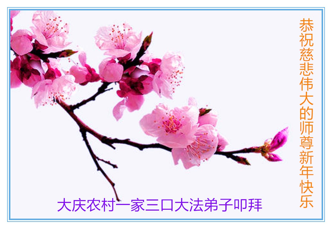 尊敬的师父您好!我们是山东平度农村大法弟子,在此新年到来之际,敬祝师父新年快乐!在新的一年里,我们努力做好三件事,讲清真相,救度众生。 黑龙江省大庆农村大法弟子恭祝慈悲伟大的师尊新年快乐!
