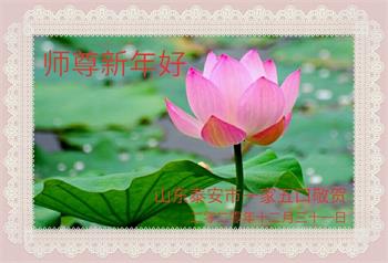 尊敬的师尊您好!我是来自山东的大法弟子,在新年来临之际,我代表全家人恭祝师尊新年好!在新的一年里,我将多学法,时刻保持精進状态,努力做好三件事,多救人,不辜负师尊的期望和众生的期盼。 山东省烟台市龙口市大法弟子恭祝师尊新年好!