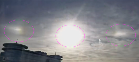 【明慧网二零二一年一月三日】二零二零年十二月二十九日,《新京报》等多家中国媒体报导,北京市天空出现“三个太阳”的“幻日”景象。拍摄视频的网民表示,从当天早上九时左右,全程约持续两小时。有网友发帖称:“北京全城均可见双侧幻日,部分地区还有环天顶弧和极淡的46度晕,怀柔有外接晕”。 2020年12月29日,北京市上空出现“三个太阳”的“幻日”景象(视频截图)。 |