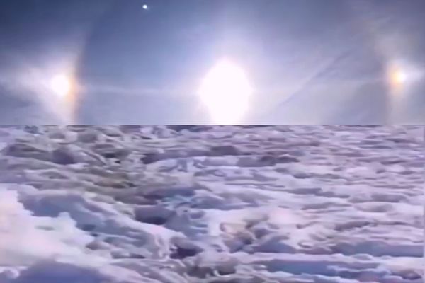 十月十五日,黑龙江省漠河市天空也曾出现“三个太阳”景象。这种稀有奇观,现今科学界的解释无法让人信服。  2020年10月15日黑龙江大兴安岭地区漠河市天空出现三个太阳。 |