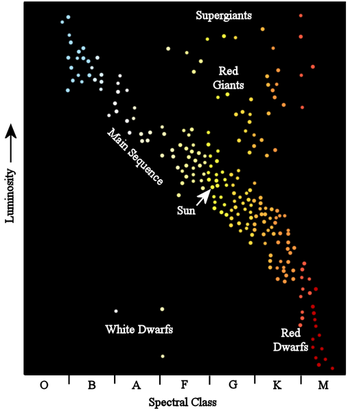 我们看到,轨迹曲线从红色范围出发,逐步穿越了赤、橙、黄等各色区域,最后到达蓝色部份。但是在中间绿色一带时,轨迹穿过的色彩其实是几种光色交汇处附近的一个很亮的地方,色彩感觉并不明显。所以在极高的亮度下,人看到的颜色就成了一种无色彩倾向的亮色,人们视之为白色。因此,在赤、橙、黄之后,我们看到的就不是绿色了。 当曲线达到蓝色光那里时,轨迹线避开了紫色的区域,这也对应了人类在现有宇宙空间一直看不到紫色恒星的事实,因为整体上从红到蓝就是全部了,而不是红绿或红紫。由于原理类似,熔炉火焰的颜色在这个空间也是从红到蓝就结束了。  图例:这幅示意图(赫罗图)展示了恒星的光度与色彩,我们看到恒星的颜色整体分为红、橙、黄、白、蓝白、蓝几色。 |