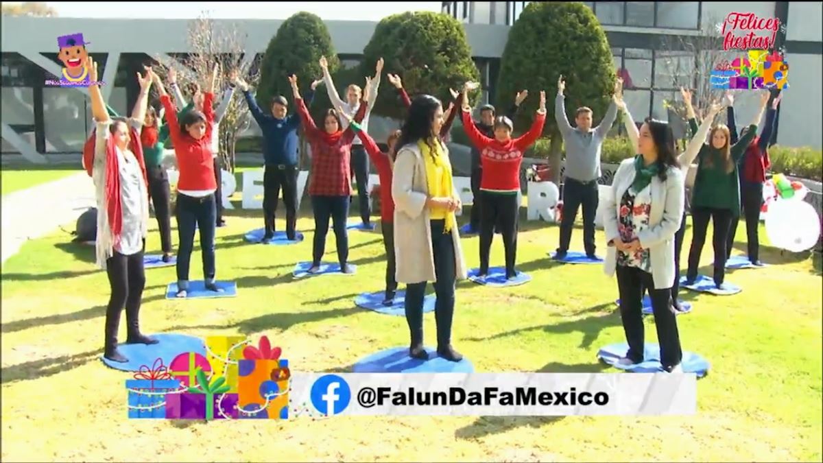 詹妮弗解释:“真、善、忍是法轮大法所教导的基本原则。在日常生活中,如在工作中,在与家人、和遇到的任何人的相处中,我们都会以他为指导,处事待人。” 她并说:“而且我们每天都会炼功,让身体干净、纯洁,充满活力和能量的去面对任何事情……”詹妮弗补充,在遇到问题时,大法的修炼原则会在脑中浮现,例如“忍”,这个原则很重要,能帮助我们更好的面对日常生活中所遇到挑战。  图3~4:采访结束后,学员们展示了第三套法轮功功法,让观众们感受到功法“缓、慢、圆”的功法特征。法轮功学员也介绍了炼功对身体的好处,以及自己如何在家里炼的要点。(图片来源:Mexiquense TV) |