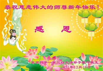 慈悲伟大的师尊好!师尊辛苦了!北京市大法弟子谢师恩!遥祝师尊元旦快乐!慈悲伟大的师尊您好!师尊辛苦了!感恩师尊慈悲苦度! 感恩师尊塑金身,感恩师尊启正念;感恩师尊悉心安排我们在大法中结圣缘,敬请师尊放心,我一定谨记师尊教诲,多学法、学好法,整体配合,共同提高;以法为师、精進实修,走好、走正最后的修炼路,紧紧跟上正法進程,兑现史前誓约,跟师尊回自己真正的天国家园! 感恩与师尊同在 感恩与大法同在 北京一市大法弟子携全家敬上 二零二一年十二月二十五日 北京市一大法弟子携全家恭祝师尊元旦快乐!感恩师尊慈悲苦度!