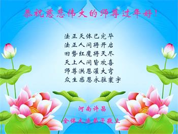 我们虽然生活在污泥浊水的中国大陆;但我们在师父慈悲的光环下,每位大法弟子的心灵却充满了阳光、喜悦、希望。尽自己所能做着师父交给的三件事。修炼已经到最后了,我们更要修好自己,同化大法真、善、忍。盼众生得救,大法弟子圆满随师还! 河南许昌全体大法弟子恭祝慈悲伟大的师尊新年好!