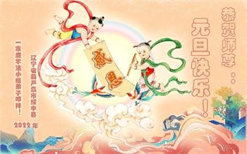 在过去的一年里,我们学法小组在师父的加持下,学法、修心,互相配合反迫害,救众生。 在新的一年里,我们要更加精進,更好的做好三件事,更加配合好,完成自己的历史使命。 葫芦岛市一学法小组全体大法弟子 2021年12月23日 辽宁省葫芦岛市全体大法弟子恭祝慈悲伟大的师尊元旦快乐!
