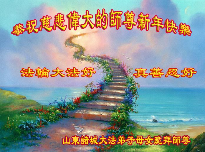 师父!新年好!您辛苦了! 感谢您的慈悲救度!您不但给了我一个健康的身体,更让我明白了怎样做一个真正的好人,做一个道德高尚更更高尚的人。 虽然我有很多人心,但我会按照“真善忍”原则指导自己好好修炼的,我会让更多的人知道法轮大法的美好,从而得到救度。 山东潍坊昌邑市一大法弟子叩拜 山东省潍坊市诸城市大法弟子母女俩恭祝伟大慈悲的师尊新年快乐!