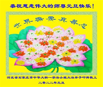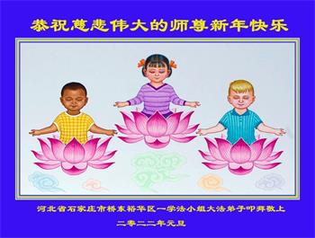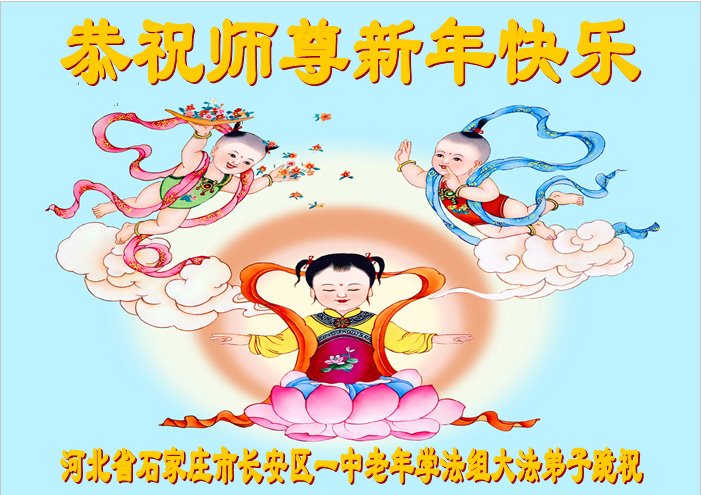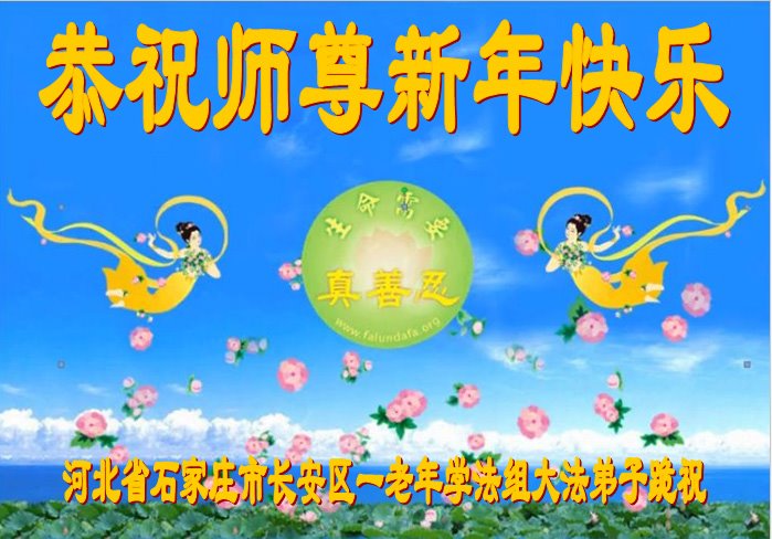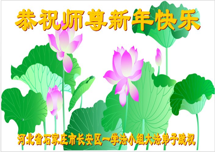 师父您好!谢谢师父的慈悲救度!弟子坚定信师信法,修好自己,救度众生。 河北省石家庄金马小区一学法小组全体大法弟子恭祝师尊新年快乐!感恩师尊慈悲救度!