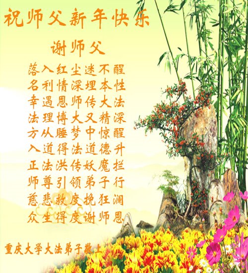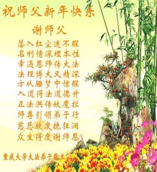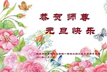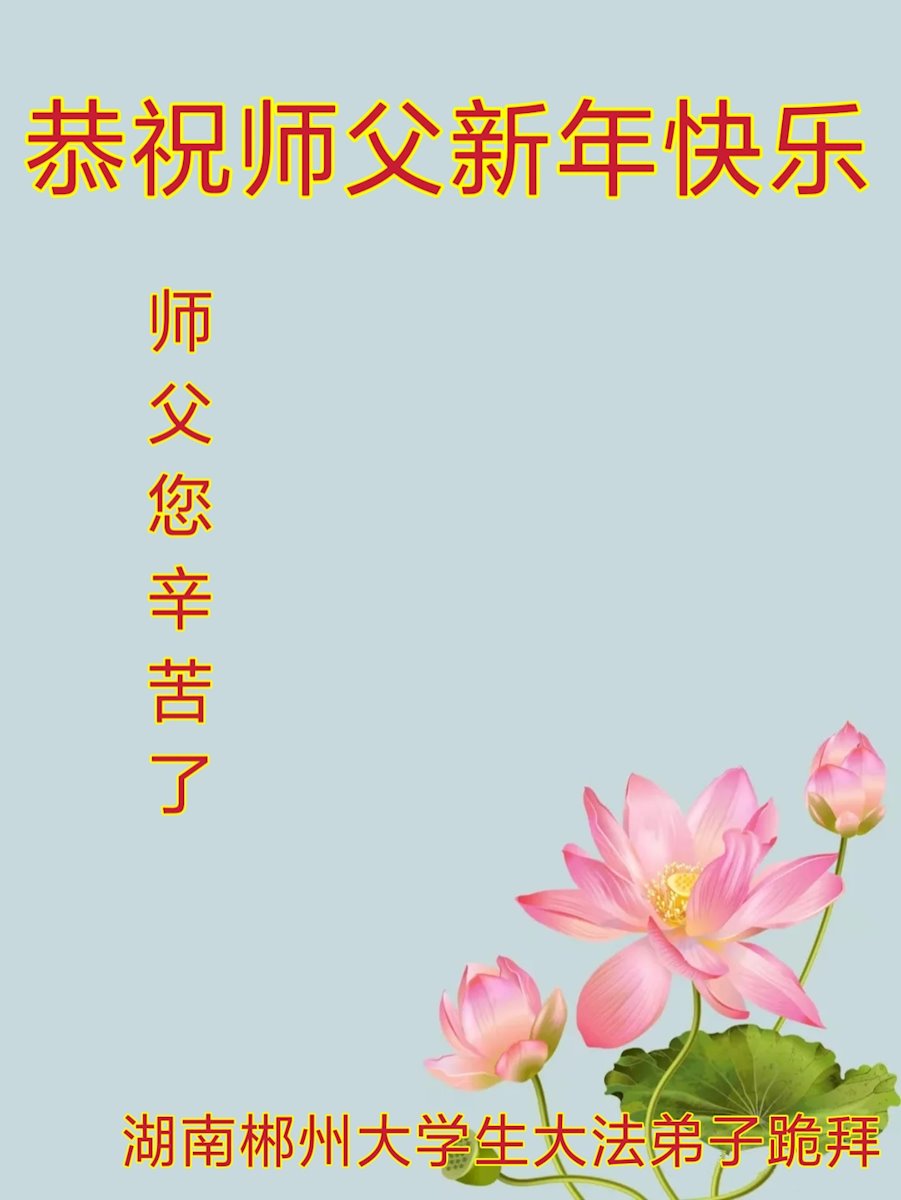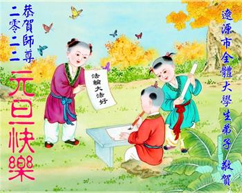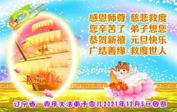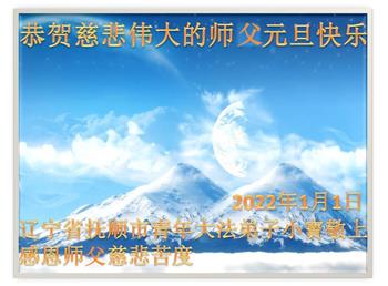 | 【明慧网二零二一年十二月二十九日】(明慧网记者综合报道)二零二二年新年来临之际,中国大陆各地青年大法弟子们通过贺词贺卡,遥寄他们对师父的思念,恭祝师父元旦快乐! 湖南郴州一位大学生大法弟子说:“感谢师父多年来的保护,让我有幸出生在一个学大法的家庭,从小沐浴在大法中,遇到事情总能逢凶化吉,从小到大身体都很健康。弟子会在今后的修炼中,抓紧时间做好三件事,不辜负师父的慈悲苦度,紧跟师父回家。” 吉林省辽源市青少年大法弟子们写道:我们很荣幸在这样一个年代转生世间,成为一名荣耀的大法弟子。我们有随家人长辈得法的,有在大法弟子讲真相后得法的。大法让我们知道什么是真正的对错善恶,使我们不再迷失,找寻到了回归天国美好家园的路。 天津市一学法小组的青年大法弟子恭祝慈悲伟大的师尊新年快乐!“弟子们一定要修好自己,不辜负师尊的慈悲苦度。用善的力量救人,按照师父的宇宙大法真善忍做,精進实修,救更多人。” 重庆市潼南区一青年大法弟子恭祝师尊新年快乐!谢师父救度洪恩!江苏省大专院校大法弟子谢师洪恩!恭祝师父新年快乐!四川眉山一青年大法弟子敬祝师尊新年快乐!江西赣州一青年大法弟子恭祝师父元旦快乐!湖南科技大学大法弟子恭祝慈悲伟大师尊元旦快乐!我觉的我非常非常幸福快乐!我感恩师父!感恩大法!我今生能得大法,能成为大法弟子的一员,我万分的幸运,弟子一定要好好的修炼,不辜负师父的慈悲苦度,跟师父回家。 湖南湘潭科技大学大法弟子 合十 云南昆明一青年大法弟子恭祝师父新年快乐!感恩师父!黑龙江桦南县青年大法弟子祝师父元旦快乐!又一年过去了,随着正法進程加快,时间也越来越快了。弟子会时刻记住自己是个修炼人,时刻站在为大法、为众生的基点上,回归本质,救度有缘人! 弟子祝师父元旦快乐!跪拜师父! 河北石家庄市一青年大法弟子恭祝师父新年好!师父好! 不管路有多难,我都会坚定正念做好该做的,遇到挫折不动摇、不消沉、不放松、不放弃,知道师父时时在身边,跌倒了,马上爬起来。在所剩不多的时间里修去所有执着、修得无漏。弟子会新年添正念。 恭祝师父新年快乐! 2021年12月15日 天津市滨海新区大港学法组青年大法弟子恭祝慈悲伟大的师尊新年快乐!师父辛苦了! 悟到自己担负着救度众生的重要使命,不管过程再怎么艰难,赶紧平衡好学法、炼功、发正念的状态,归正调整自己,回到救人的初衷与基点。深感大法弟子修好自己、救度众生的重要与紧迫,一定会在最后路上把握有限时间勇猛精進、兑现誓约。 2021年12月19日 辽宁省一青年大法弟子恭贺慈悲伟大的师尊新年快乐!每逢佳节倍思亲 弟子叩拜谢师恩 净化心灵身轻健 返本归真紧跟师 大法开启先天智 舞动神笔除妖孽 助师正法兑誓言 旧势已去新宇明 感恩师尊慈悲救度,您辛苦了!弟子想您! 辽宁省一青年大法弟子雪儿敬贺! 2021年12月5日 吉林省公主岭市青年大法弟子祝师尊新年快乐!吉林省辽源市全体青少年大法弟子祝师尊新年好!我们是辽源市青少年大法弟子,从小学到大学不同年龄段都有,我们很荣幸在这样一个年代转生世间,成为一名荣耀的大法弟子。我们有随家人长辈得法的,有在大法弟子讲真相后得法的。 我们都有人善良的本性,但是在这样一个污浊的世界里,我们找不到方向,只有大法给予我们所要的一切,知道什么是真正的对错善恶,使我们不再迷失,找寻到了回归天国美好家园的道路。 我们知道现在是天灭中共的最后时刻,我们惦念和我们有缘的亲友,我们想办法以不同方式告诉了他们真相,让他们也能明白的得救。我们知道做的还不够,会继续努力。这里我们感谢师尊救度!恭贺师尊新年好! 辽源市全体青少年弟子二零二二年元旦敬贺! 天津市滨海新区大港学法组青年大法弟子恭祝慈悲伟大的师尊新年快乐!天津市滨海新区大港学法组青年大法弟子恭祝慈悲伟大的师尊新年快乐!师父辛苦了! 弟子们一定要修好自己,不辜负师尊的慈悲苦度。用自身证实法轮大法,用善的力量救人,按照师父的宇宙大法真善忍做,精進实修,我们一定要多学法、学好法,救更多人。 吉林省辽源市全体大学生大法弟子祝师尊元旦快乐!能修大法是圣缘 洗净尘垢上法船 人中名利抛脑后 助师正法是本愿 长春市吉林大学大法弟子恭祝师父新年快乐!重庆市沙坪坝区大学城一学法小组三名大法弟子恭祝师尊元旦快乐!南京师范大学大法弟子恭祝师尊元旦快乐!中科院大法弟子恭祝最伟大的师尊新年快乐!辽宁抚顺市一青年大法弟子恭祝师父2022年新年快乐!北京市昌平区青年大法弟子恭祝师父新年快乐!在新年来临之际,弟子恭祝慈悲伟大的师父新年快乐! 在所剩不多的时间里,弟子会做好三件事,修好自己,完成好助师救人的誓约。 北京市昌平区青年大法弟子敬上 湖南省郴州市大学生大法弟子恭祝慈悲伟大的师父新年快乐!湖南郴州大学生大法弟子恭祝慈悲伟大的师父新年快乐!师父您辛苦了! 感谢师父多年来的保护,让我有幸出生在一个学大法的家庭,从小沐浴在大法中,遇到事情总能逢凶化吉,从小到大身体都很健康。弟子会在今后的修炼中,抓紧时间做好三件事,不辜负师父的慈悲苦度,紧跟师父回家。愿师父少一份操心,多一份欣慰。 河北省大学在校大法弟子恭祝师父新年快乐!湖南湘潭大学大法弟子恭祝慈悲伟大