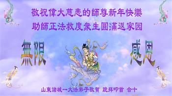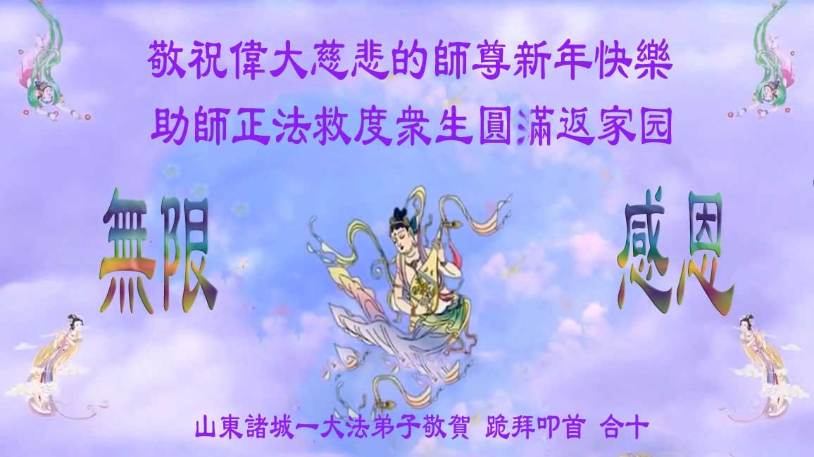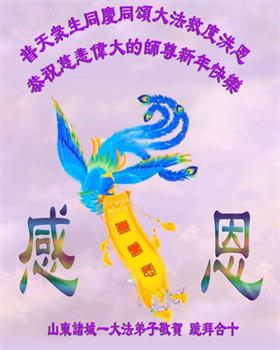 山东诸城全体大法弟子恭祝师尊新年快乐! 在这普天同庆同祝法正天体已结束,正在向法正人间过度的时刻,诸城全体大法弟子将更加精進,整体提高整体升华,用神性随师尊法正人间。特别是反复拜读师尊新经文《醒醒》后,更加认识到了修炼的严肃性,深刻体会到了救度众生的紧迫感。在这值千金值万金的最后时刻,清除结束人的一切观念、行为。完全同化大法,全体大法粒子,散发出无私无我,先他后我的法的光芒,让众神羡慕、让众生佩服,不愧为大法造就的佛、道、神,助师正法救度众生的大法徒!精進吧!同修们!让我们形成象金刚一样坚如磐石的整体,用大法给予神的智慧、理性、慈悲,随师法正人间。完成神圣的使命,圆满随师还!虔诚的感恩师尊洪大的慈悲!感谢大法造就了我们!跪拜叩头合十! 山东诸城全体大法弟子敬贺! 山东省潍坊市诸城市一大法弟子恭祝师尊新年快乐!
