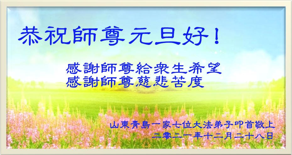 恭祝师尊元旦好! 感谢师尊给宇宙众生希望! 感谢师尊慈悲苦度! 山东青岛一家七位大法弟子叩首敬上 二零二一年十二月二十八日 山东省青岛市莱西大法弟子恭祝师尊新年快乐!师尊您辛苦了!