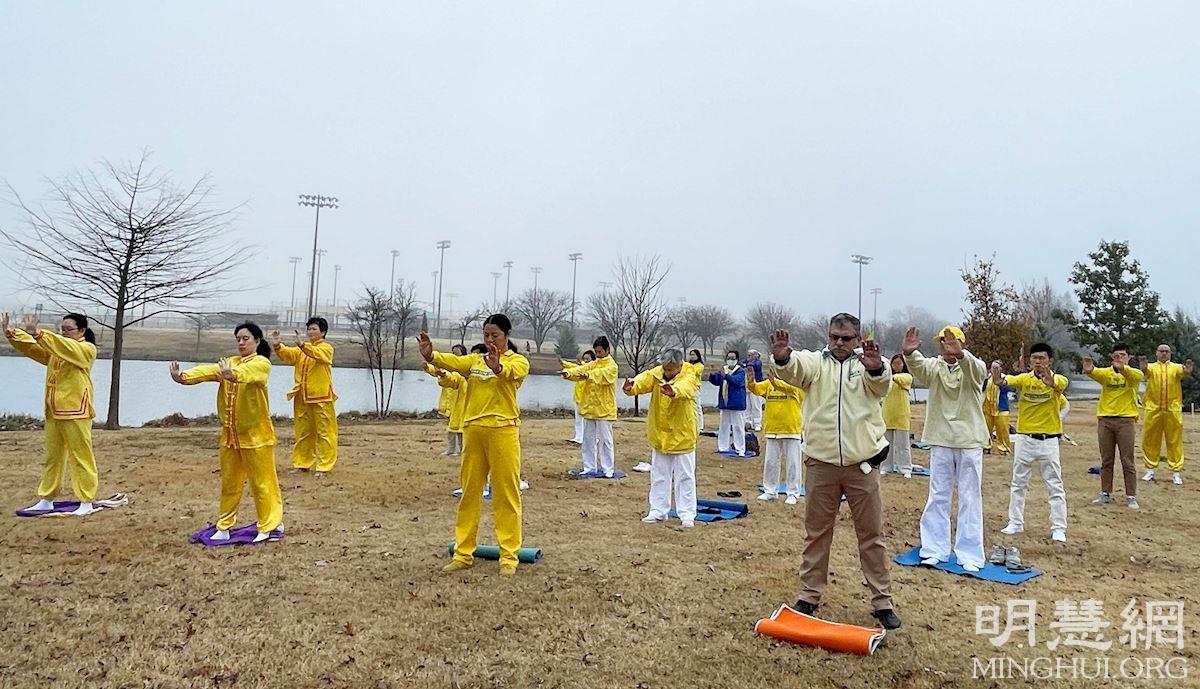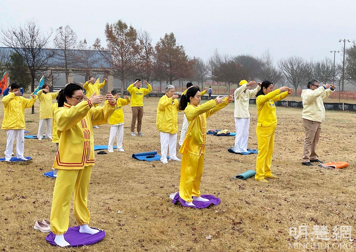 【明慧网二零二一年十二月三十日】(明慧网记者曾洪美国达拉斯报道)二零二二年新年即将来临,美国德州达拉斯-沃斯堡地区(Dallas-Fort Worth)的法轮功学员于十二月二十六日上午在布兰诺市(City of Plano)的罗素溪(Russell Creek)公园湖畔集体炼功,向法轮功创始人李洪志先生恭贺新年! 视频:德州达拉斯法轮功学员恭祝慈悲伟大的师父新年快乐!当日清晨,法轮功学员们身着黄色炼功服,伴着悠扬、祥和的炼功音乐集体炼功,写有中英文“法轮大法”的各色彩旗迎风飘扬,整个场面给公园增添了一道美丽的风景。  图1~2:达拉斯学员在布兰诺市(City of Plano)的罗素溪(Russell Creek)公园集体炼功。 |