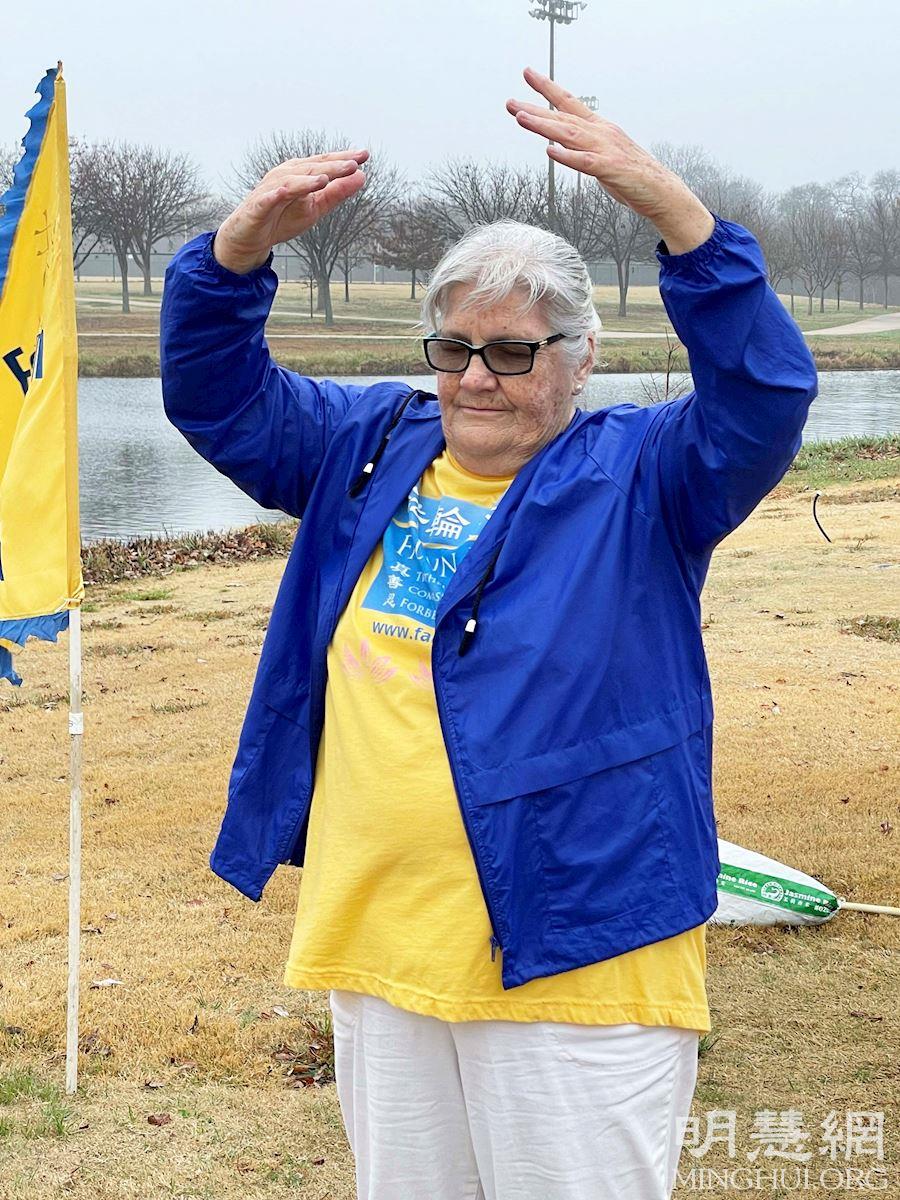 法轮大法自一九九六年传入达拉斯-沃斯堡地区,现在越来越多不同族裔的有缘人得法修炼。他们回想自己的历程,都觉得幸运,更是感恩师父! 越裔学员:想跟师父回家  图3:越裔学员金(Kim)女士正在炼功法轮功第二套功法——法轮桩法 |