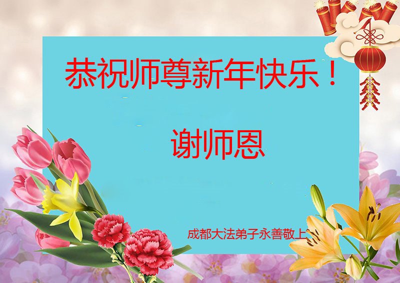 大法弟子永善感恩师尊的慈悲苦度!恭祝慈悲伟大的师尊新年快乐!师尊您辛苦了!弟子一定听师父的话,走好最后的路。助师正法,兑现使命,不负师恩,圆满随师还! 四川省成都市一大法弟子永善敬上 四川省成都市西门一学法小组大法弟子恭祝师尊新年快乐!