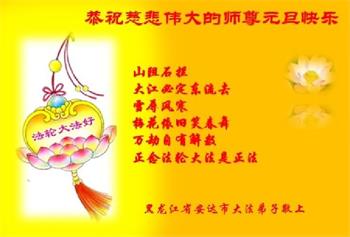 恭祝慈悲伟大的师父新年快乐!弟子叩拜师父!您辛苦了! 弟子谢谢师父洪大慈悲,把我从苦海中救起,接上圣缘,在大法中归正,一路保护走到今天。唯有实修,报师恩。 黑龙江省宁安市大法弟子归正敬上 黑龙江省牡丹江市宁安市大法弟子一家人恭祝慈悲伟大的师父新年快乐!