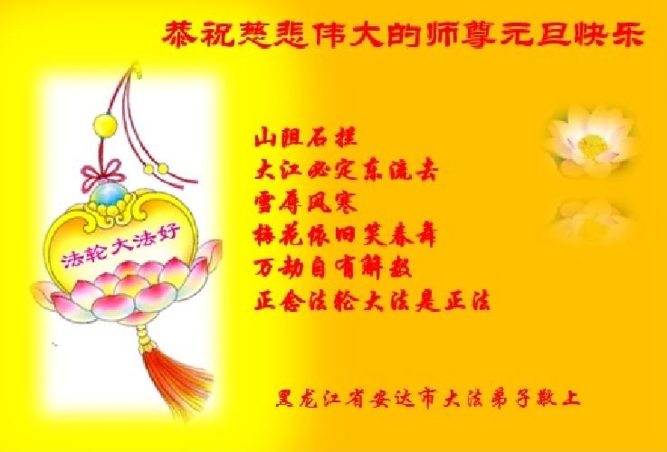 恭祝慈悲伟大的师父新年快乐!感谢师父慈悲救度!在正法的修炼路上,磕磕绊绊走到今天,谢谢师父的一路保护! 大法弟子姐妹俩敬上 黑龙江省牡丹江市宁安市一大法弟子恭祝慈悲伟大的师父新年快乐!