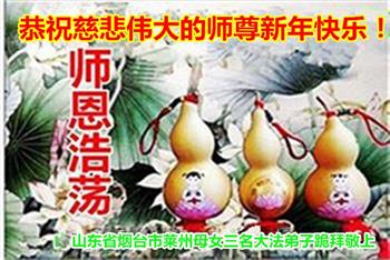 山东省烟台市莱州母女三名大法弟子恭祝慈悲伟大的师尊新年快乐! 山东省烟台市莱州一学法小组大法弟子恭祝慈悲伟大的师尊新年快乐!