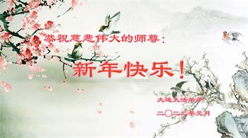 恭祝师尊新年快乐! 辽宁省大连市旅顺口区全体大法弟子敬上 辽宁省大连市开发区一大法弟子恭祝师尊新年快乐!