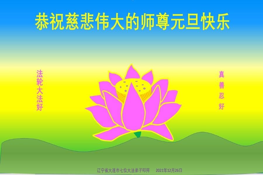 恭祝慈悲伟大的师尊元旦快乐! 感恩师尊的洪大慈悲与救度!弟子们坚定走大法修炼路,不断去掉各种执着心,正念正行,做好三件事,勇猛精進,随师返家园。 辽宁省大连市七位大法弟子叩拜 辽宁省大连大法弟子恭祝师尊新年好!
