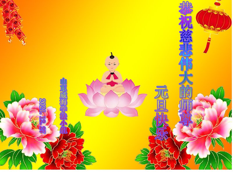 值此2022年元旦来临之际,山东兖州大法弟子恭祝师尊新年好!师父辛苦了!众弟子一定做好三件事,走好修炼救度众生之路! 山东省威海荣成市一学法小组大法弟子恭祝慈悲伟大的师尊新年快乐!