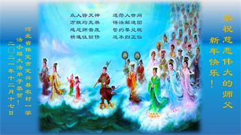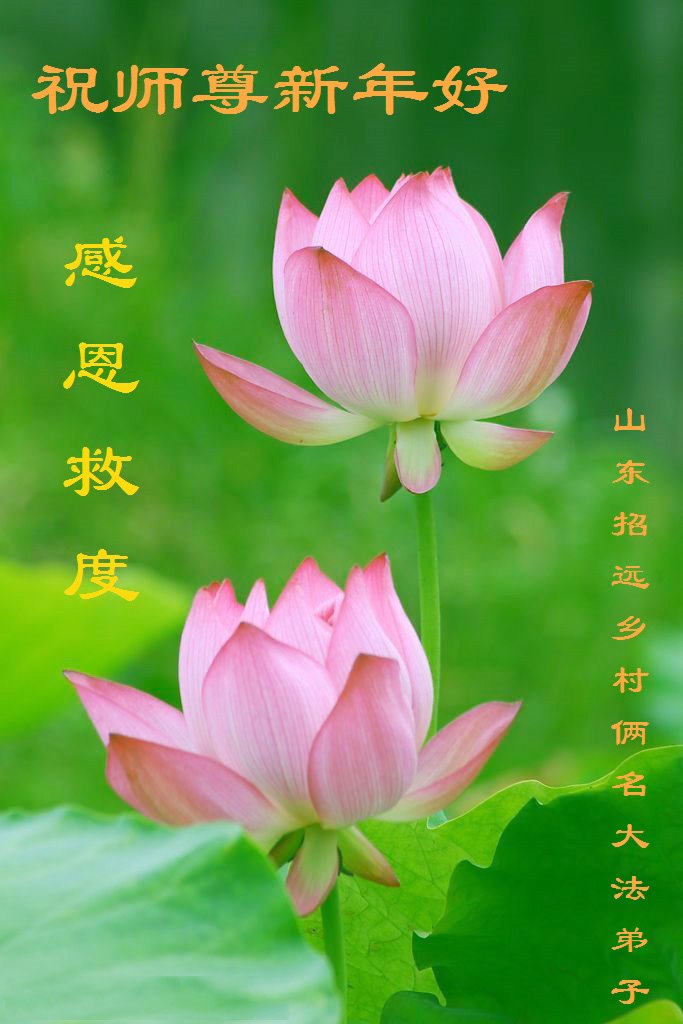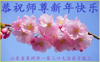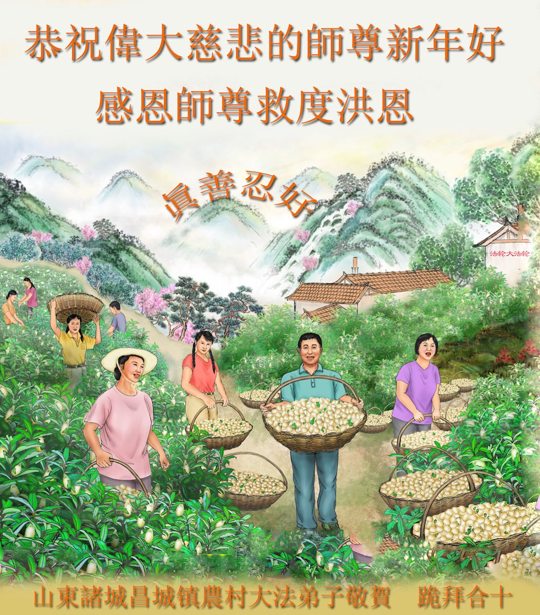 师父新年好!师父辛苦了! 您为众生的得救,用巨大的承受延长着时间,呕心沥血。弟子无比感恩师尊的慈悲。在最后的时间里,弟子一定修好自己,多学法,多救人,做好三件事,唯有再精進兑现誓约随师还。 山东烟台招远两名大法弟子敬贺! 山东省烟台市福山区农村大法弟子恭祝师尊新年快乐!