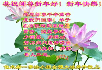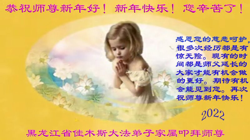 师父您好!师父您辛苦了! 弟子全家恭祝师父新年快乐!恭祝师父新年好! 新的一年就要到了,在助师正法、救度众生的风风雨雨中,弟子全家十分感恩师父的时时保护,我们知道师父就在我们身边。当在法中悟到法理时,明白是慈悲的师父在成就弟子,使我们能感到修炼升华的美妙。对照师父的法,还有很多不足,我们会在师父的法中不断精進,会珍惜这次万古机缘,珍惜师父安排的修炼路,多去执着,多去人心,修成无私无我的新宇宙正觉。 恭祝师父新年快乐!谢谢师父! 弟子全家敬上 二零二一年十二月二十四日 黑龙江省佳木斯学法小组全体大法弟子恭祝慈悲伟大的师尊新年快乐!
