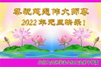 二零二二年元旦来临之际,北京大兴区学法小组大法弟子向慈悲伟大师尊致以最崇高敬意!恭祝慈悲伟大师尊元旦快乐!师父您好!师父您辛苦了!师父谢谢您! 我们要听师父的话,多学法,学好法,向内找,在法上提高,做好三件事,多救人,圆满随师还。 北京市昌平区明真相世人恭祝李洪志大师新年快乐!