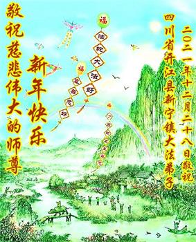 师尊,您辛苦了!在这新的一年里,弟子更加精進,多发正念!多救人!在法中归正自己的一思一念,达到大法的要求,圆满随师还。多谢师尊慈悲救度!师恩浩荡! 得救 群峰仙鸟鸣 助师圣莲清 世间救人急 法徒不畏惧 创世多少事 步步正广庭 众生登法船 佛恩化天晴 四川省绵阳市全体大法弟子恭祝师尊元旦快乐!