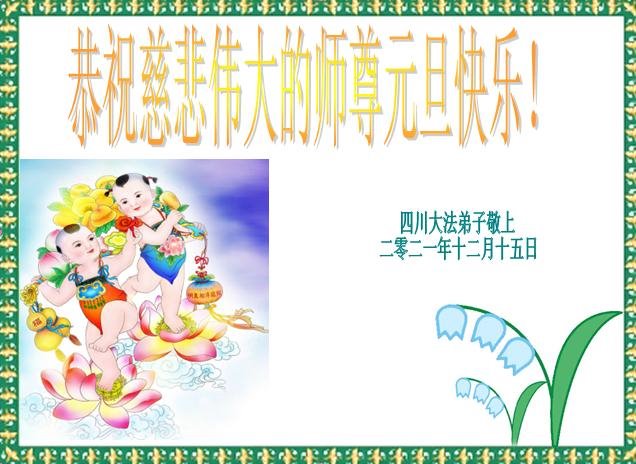 恭祝师尊新年快乐! 大疫当前,全球人心动荡不安,弟子是何其的幸运,在这末劫时期得到师尊大法救度,心存真善忍,心里有大法,大法给予的力量,弟子们讲清真相,给更多的世人带来得救的希望。 谢谢师尊!谢谢师尊! 四川省德阳市中心一学法小组大法弟子敬上 二零二一年十二月二十五日 四川省南充市一大法弟子恭祝师父元旦快乐!