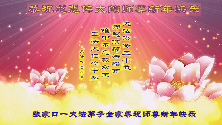 感谢师父把我从地狱里救出来,引领弟子走上修炼的路。感恩师父时时刻刻对弟子的看护,我永远都说不尽道不完对师父的感恩!我要多看书多学法,修好自己,一心一意做好三件事,在最后的时间里走好自己修炼的路。 河北张家口大法弟子恭祝师父新年快乐!