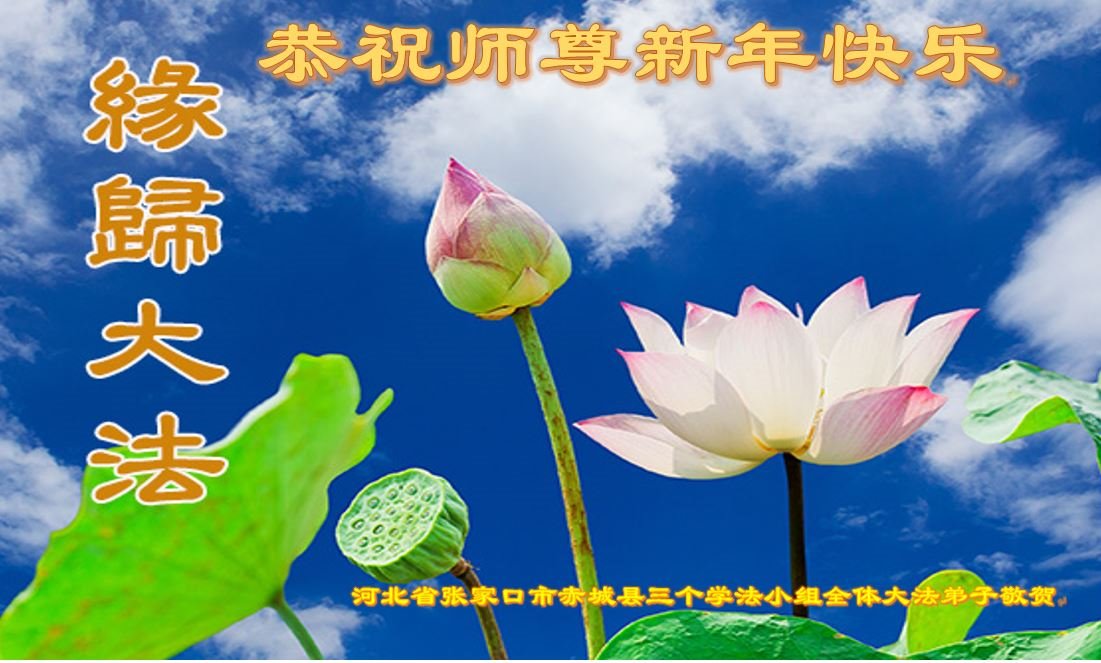 恭祝慈悲伟大的师尊新年快乐!感恩师尊二十多年的慈悲保护,弟子一定修好自己,做好师尊要求的三件事,随师尊回家! 河北省张家口市赤城县三个学法小组全体大法弟子恭祝师尊新年快乐!