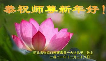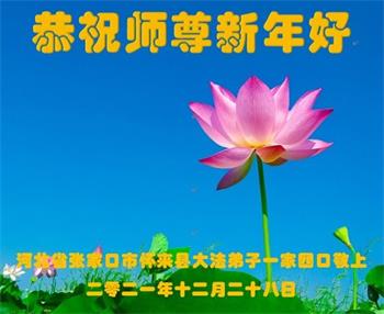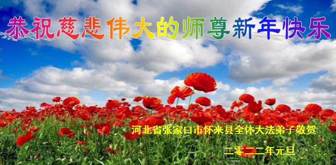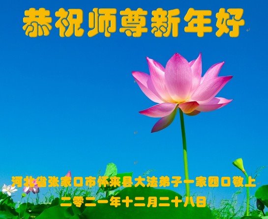 尊敬的师父好:恭祝师父新年快乐!法轮大法好!真善忍好! 用尽人类的千言万语也说不尽师父对我们的慈悲救度之恩。 师父啊,当弟子迷失的时候,是您为我们指明方向;当弟子跌倒的时候,您将我们扶起。魔难中,您点悟着弟子,为弟子拨开迷雾;危难时,您为弟子承受太多太多。 师父啊!您辛苦了!弟子知道不精進,辜负了师父。 在新的一年里,弟子怎能再执着?弟子一定要学好法,向内找,有新的突破。精進实修,走好最后的路,跟师父回家! 师父啊!弟子再一次恭祝师父新年好! 法轮大法好!真善忍好! 河北张家口蔚县一学法小组全体大法弟子敬上 二零二一年十二月二十八日 河北省张家口市赤城县大法弟子恭祝师尊新年好!
