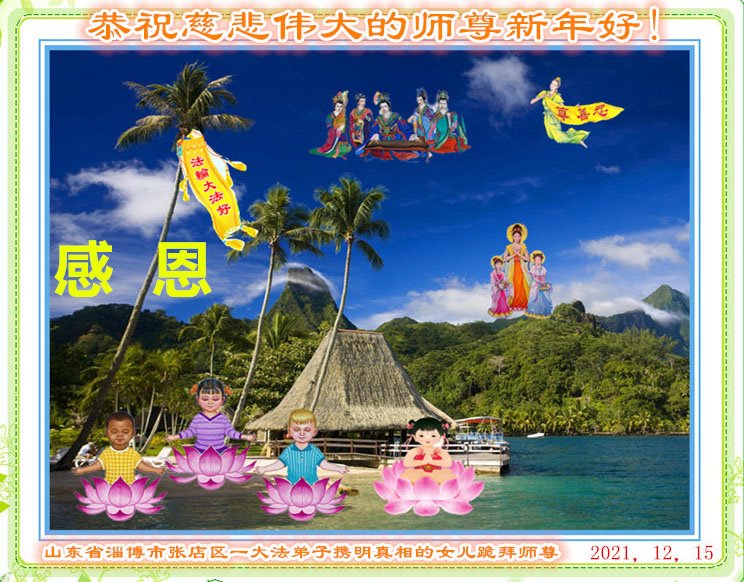 山东海阳市大法弟子祖孙三人及明真相的家人向慈悲伟大的师尊问候:师尊新年快乐!谢谢师尊的慈悲救度! 山东淄博张店一大法弟子携明真相的女儿恭祝慈悲伟大的师尊新年好!