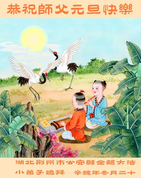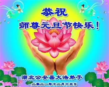 谢谢师尊的慈悲苦度! 不管世间万事变迁,不管时日还有多长,弟子们心里一定牢记师尊的教诲,做好三件事,完成使命,圆满随师还。 湖北荆州市公安县散居各村镇全体大法弟子恭祝师尊元旦快乐!