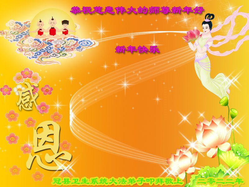 恭祝慈悲伟大的师尊新年好!新年快乐! 山东省冠县卫生系统大法弟子叩拜敬上 大陆窗帘行业大法弟子恭祝师尊新年快乐!