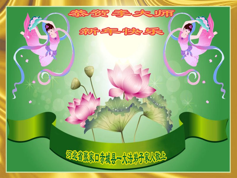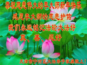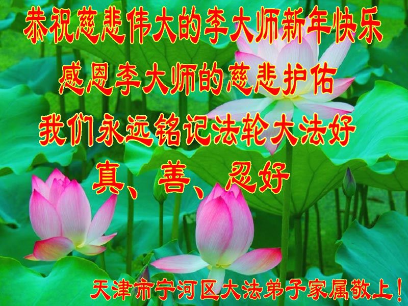 我和妻子同修代表明白真相的家人们祝师父新年快乐!叩拜师尊。 天津市宁河区大法弟子家属恭祝慈悲的李大师新年快乐!