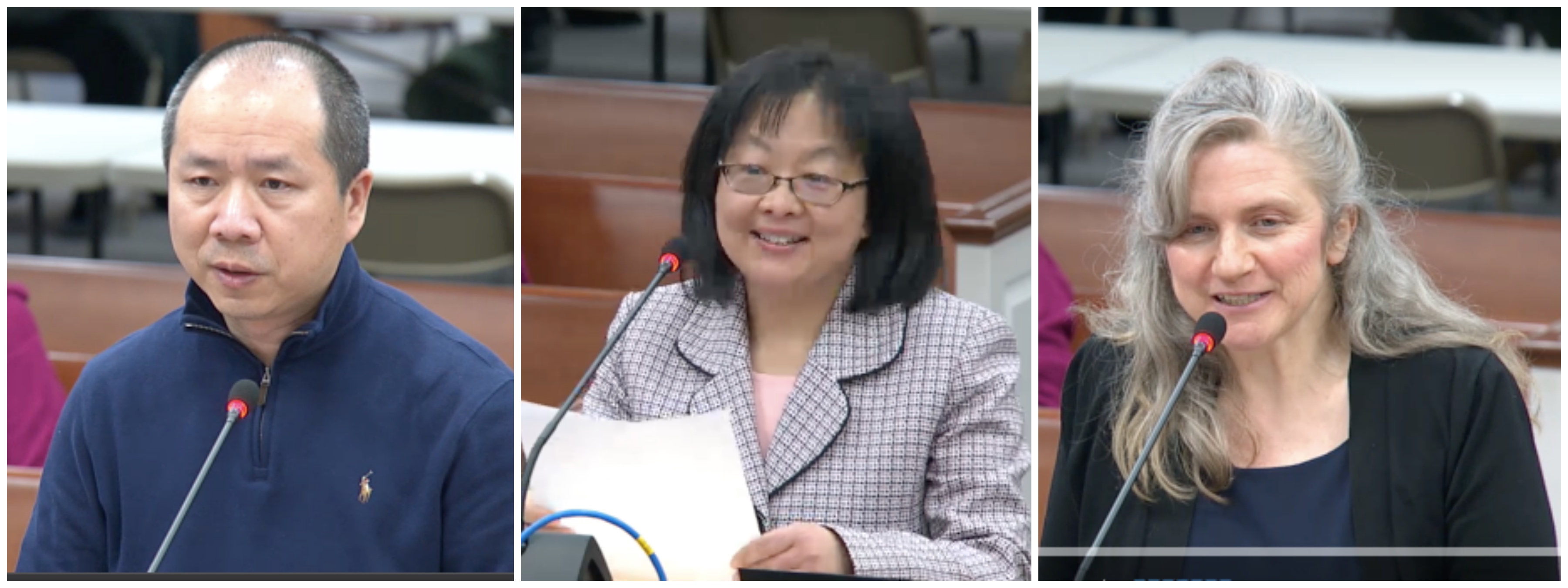 “我要感谢法轮功学员,感谢他们的勇气和坚持,让世界知道这一悲剧的发生。” 三位法轮功学员代表发言 弗吉尼亚州居民、法轮功学员亚历克斯·王(Alex Wang) 在决议案的讨论会上介绍:“法轮功是以真、善、忍为原则的古老精神修炼功法。1999年前,中共调查发现:七千万至一亿人修炼法轮功;并且,法轮功可非常有效地全面改善人体健康状况。” “但是,这令中共时任领导人江泽民妒嫉和多疑,他一意孤行于1999年7月发动了对法轮功的迫害。” Alex引用大赦国际的说法表示,(为了实施迫害)中共在国内和海外发起对法轮功大规模的妖魔化宣传运动。“对法轮功的迫害已经持续20年。即便在当前的病毒大流行期间,中共在全国范围加大了对法轮功学员的骚扰、拘留、监禁、酷刑折磨,甚至将他们迫害致死。” 弗吉尼亚州居民、法轮功学员蒂娜·唐(Tiny Tang)发言说,中共活摘器官的对象,主要针对法轮功学员。她说,“目前,我们还无法阻止中共继续犯罪,但是,我们能够防止潜在的居民沦为谋杀无辜民众的共谋。” 她举例说,当地一位居民曾经获得到中国换肾费用为5万美元的机会,但是,他放弃了这次机会,因为他了解中共的邪恶,他知道在这么短的时间内获得匹配的器官是可疑的。 弗吉尼亚州居民、法轮功学员凯瑞·努涅斯(Kery Nunez)说,“共产主义政权在犯罪的时候,总是试图拉着别人跟着他们一起犯罪。”“你们的决议案,将确保所有的县居民获得(中共)活摘人体器官的警告。我们相信,这不仅仅会拯救生命,而且同样重要的是,会拯救人的良知。”  图4: 法轮功学员代表在会上发言。从左至右:亚历克斯·王(Alex Wang)、蒂娜·唐(Tiny Tang)和凯瑞·努涅斯(Kery Nunez) |