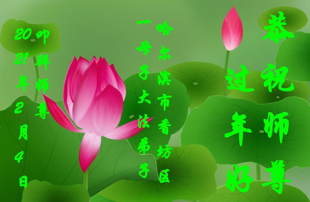 弟子给师尊拜年:恭祝师尊过年好! 弟子感恩师尊的慈悲苦度!更加珍惜修炼的机缘,在有限的时间里,尽快达到法的标准,救度众生,完成使命! 哈尔滨大法弟子敬上 二零二一年二月二日 黑龙江省哈尔滨市阿城区母女大法弟子恭祝慈悲伟大的师尊过年好!