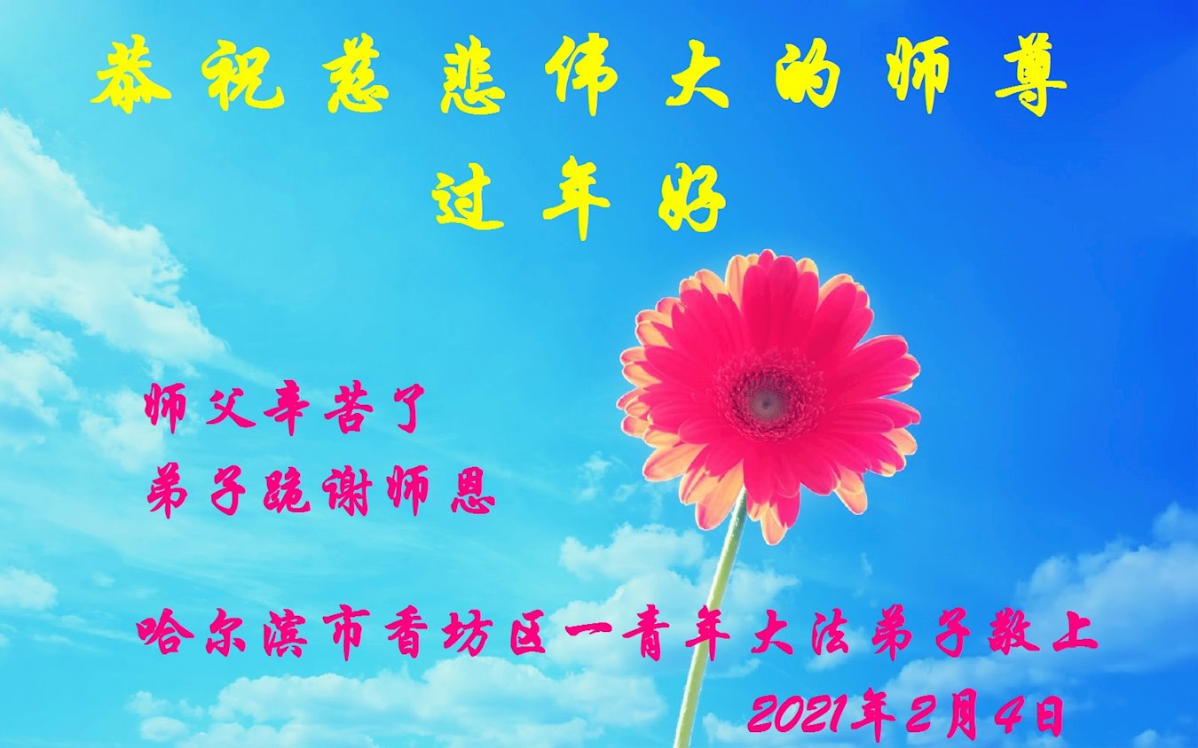 恭祝师尊过年好! 哈尔滨市香坊区一学法小组大法弟子敬上 黑龙江省哈尔滨市一大法弟子及全家人恭祝慈悲伟大的师尊过年好!
