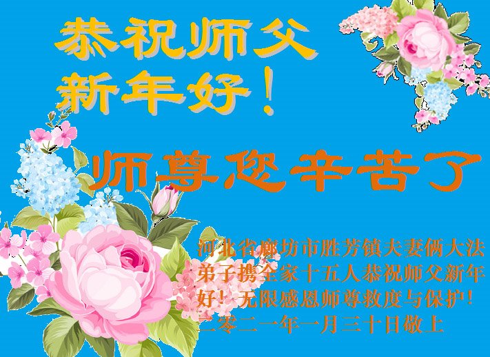 河北省廊坊市三河市燕郊镇大法弟子、黑龙江省伊春市大法弟子恭祝慈悲伟大的师尊2021年新年快乐! 新年祝愿 新年又一春, 叩谢圣师恩。 慈悲载苍宇, 恭祝愿寿新。 庚子年腊月二十四 燕郊、伊春两地大法弟子敬上 河北省廊坊市胜芳镇夫妻俩大法弟子携全家十五人恭祝师父新年好!无限感恩师尊救度与保护!