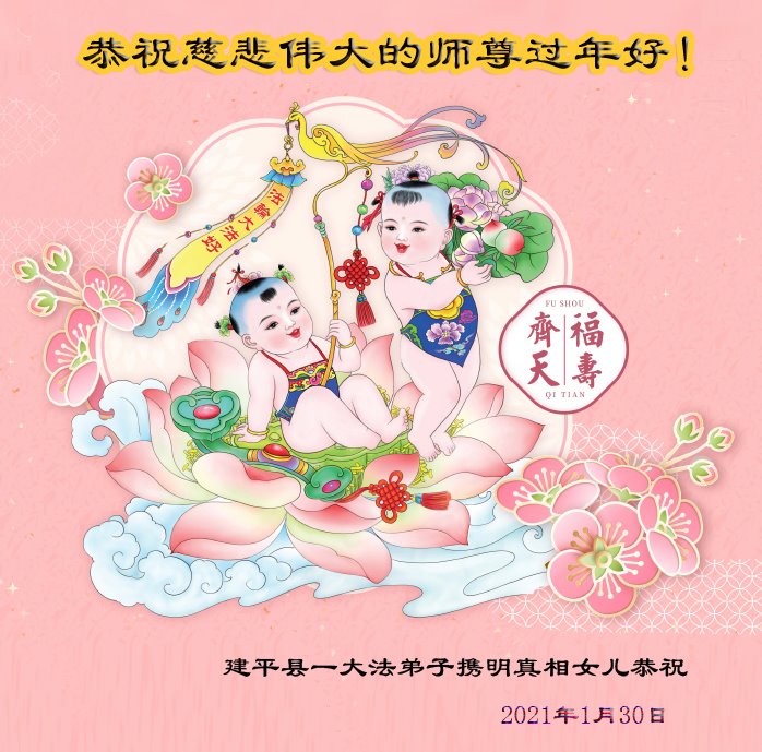 恭祝慈悲伟大的师尊:佳节快乐!过年好! 辽宁省朝阳北票市大法弟子叩拜师恩 2021年敬上 辽宁省朝阳市建平县一大法弟子携明真相女儿恭祝慈悲伟大的师尊过年好!
