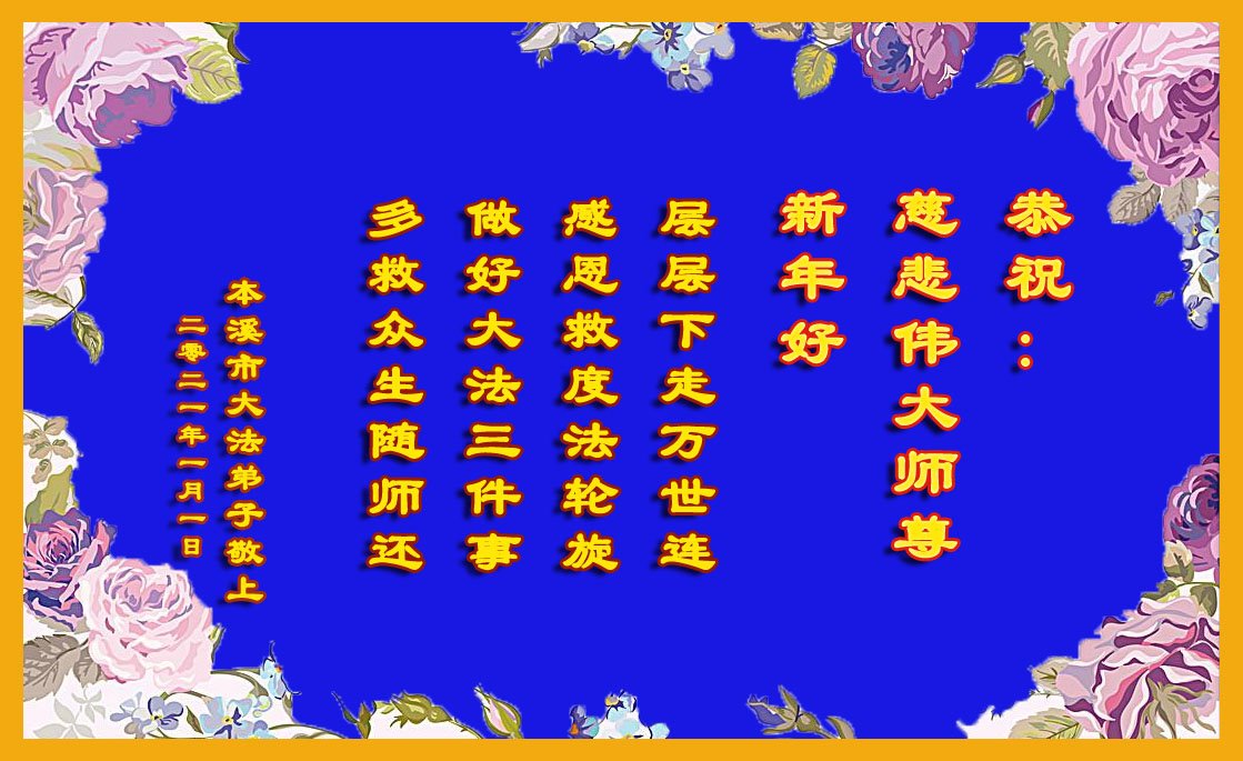 在辛丑年即将到来之际,弟子怀着一颗感恩的心,向伟大的师尊问候:师尊过年好!在正法的最后时刻,弟子唯有多救人,完成使命,兑现史前誓约。 辽宁省本溪市一中年大法弟子恭祝师尊过年好!