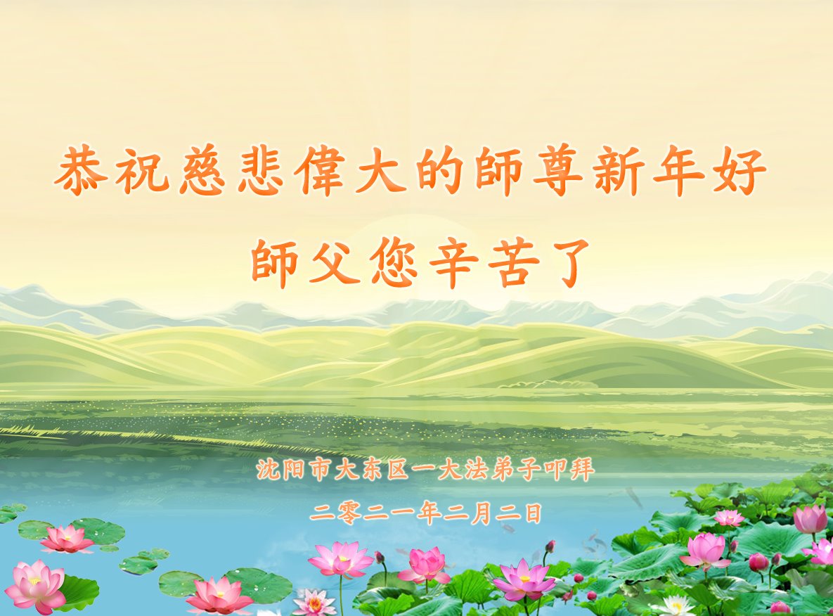 感恩慈悲伟大的师尊把我们从地狱里捞出来,引领我们走在返本归真的神路上。弟子感恩之心无以言表,弟子唯有听师尊的话做好三件事,精進!精進!精進!在中国新年即将来临之时,弟子遥拜师尊!合十! 辽宁省沈阳大法弟子恭祝师尊新年快乐!