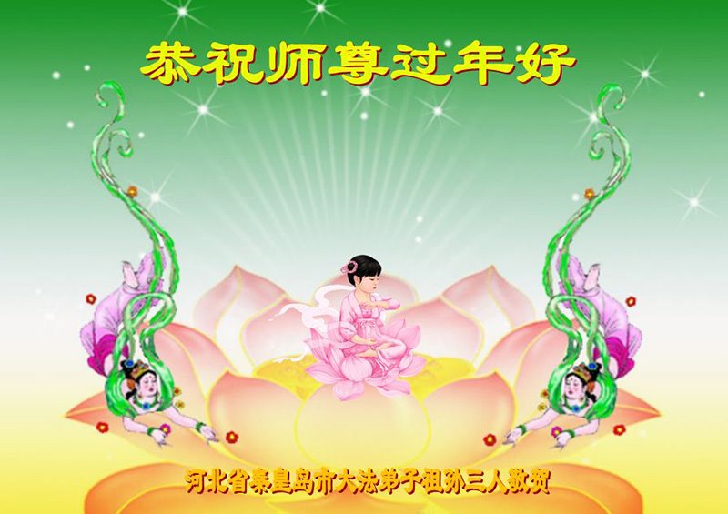 恭祝慈悲伟大的师尊新年快乐! 感恩师父慈悲苦度! 河北省秦皇岛市大法弟子叩拜敬上 河北秦皇岛市大法弟子恭祝慈悲伟大的师父过年好!