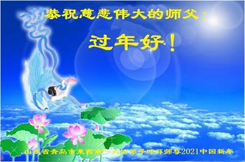 师父您好,您辛苦了! 在中国新年来临之际,恭祝师父过年好!弟子给您拜年了!每逢佳节弟子想念师父,千言万语也无法表达师父的浩荡洪恩,弟子感谢师父的慈悲苦度。 在新的一年里,我们一定紧跟师父的正法進程,听师父话,用心学好法,事事对照,管住自己的一思一念,尽快修好自己,完成好救人使命,跟师父圆满回归。 青岛崂山大法弟子敬上 山东青岛东部大法弟子全家恭祝师尊新年快乐!叩谢师尊慈悲救度!