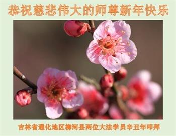 白城全体大法弟子恭祝慈悲伟大的师尊新年好! 在辛丑年到来之际,弟子更加想念师尊,感恩师尊对弟子的慈悲保护!一次次的指引弟子前行,引领着我们走过风雨艰险岁月。弟子会努力做好三件事,多学法,修去人心,讲清真相多救人,坚定的跟随师尊返回自己真正的家园。 再次恭祝慈悲伟大的师尊新年快乐! 吉林省白城大法弟子敬上。 二零二一年一月十八日 吉林省通化地区柳河县两位大法学员恭祝慈悲伟大的师尊中国年快乐!