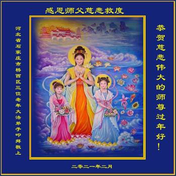 河北省石家庄市桥西区三位老年大法弟子叩拜敬上 二零二一年二月 河北省石家庄市桥东裕华区一学法小组大法弟子恭祝慈悲伟大的师尊过年好!