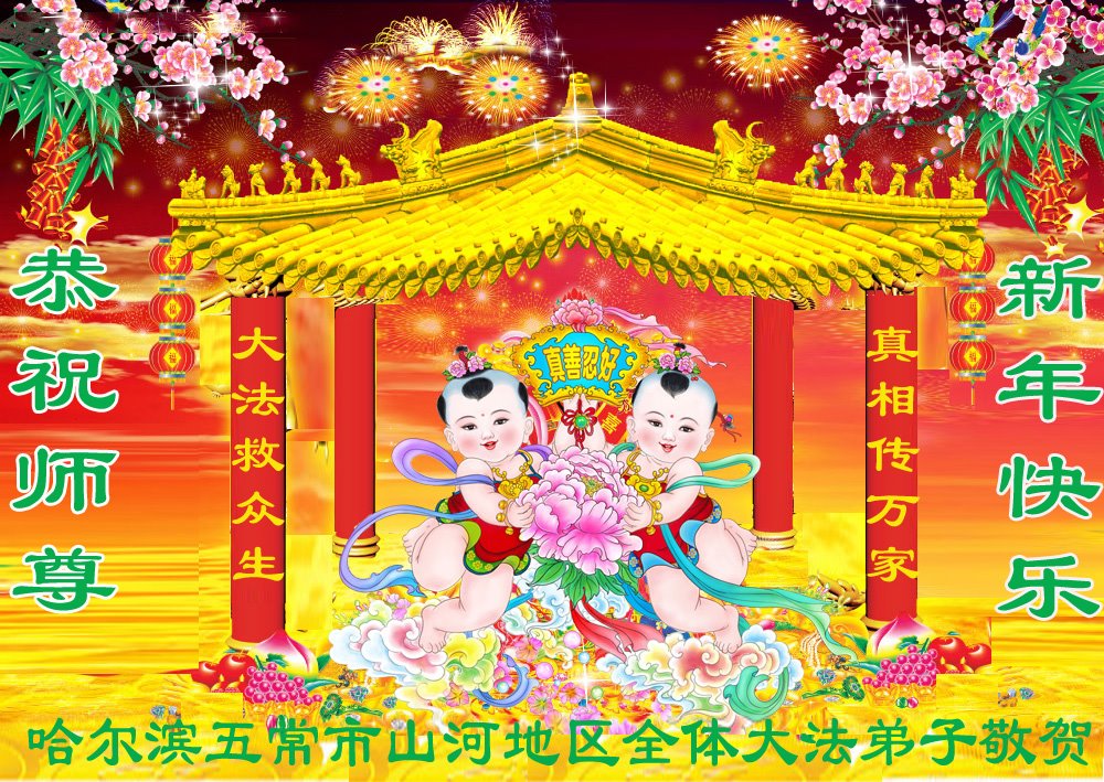 黑龙江省哈尔滨市五常市山河地区全体大法弟子恭祝师尊新年快乐!